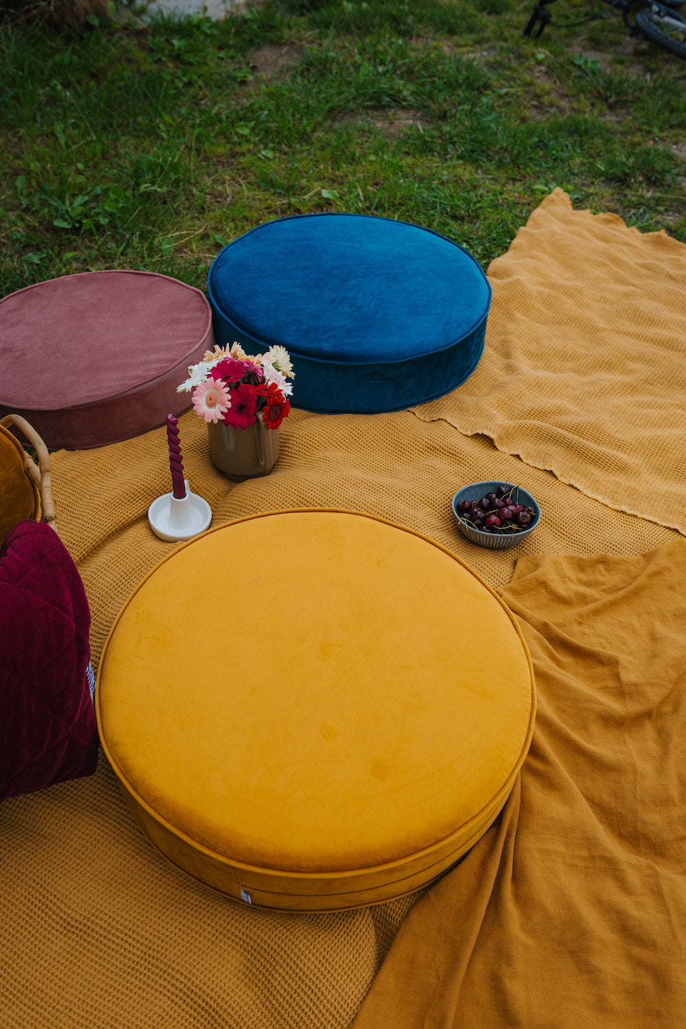 Großer Samt-Bodenpouf. Runder Bodenhocker. Ottomane für die Gartenparty.